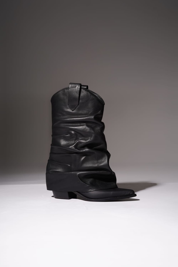 Bota caña media en cuero vacuno color negro con efecto arrugado.
